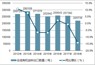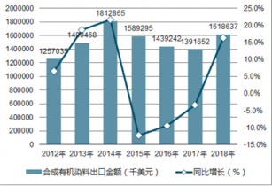 2018年1-12月中國合成有機染料出口數量為220739噸,同比下降14.2%;2018年1-12月中國合成有機染料出口金額為1618637千美元,同比增長16.3%。