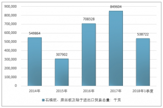 2016年我國石棉紙、麻絲板及氈子進出口貿易總量708328千克 ,2017年進出口貿易總量849604千克 ;2019年1季度進出口貿易總量538722千克 。