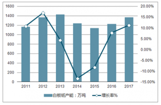 在造紙行業淘汰落后產能的同時,造紙行業新增產能受到環保政策趨嚴的限制,各紙種實際新增產能受限,考慮產能淘汰及產業結構調整,部分紙種總產能呈下降趨勢。文化紙方面,雙膠紙和雙銅紙近幾年基本無新增產能,而總產能則持續下降,其中銅版紙產能從2011年的799萬噸下降到2017年的660萬噸;白卡紙和白板紙方面,因部分新增產能投產,總產能整體呈增長態勢。