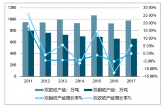 2011-2017年中國雙膠紙、雙銅紙產能及產能增長率