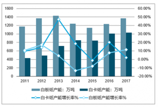 2011-2017年中國白板紙、白卡紙產能產能及產能增長率