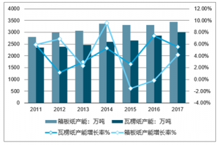 2011-2017年中國箱板紙、瓦楞紙產能及產能增長率