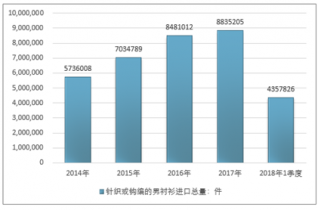 2016年我國針織或鉤編的男襯衫進口總量8481012件,2017年進口總量8835205件;2018年1季度進口總量4357826件。