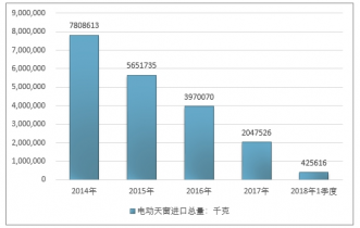 2016年我國電動天窗進口總量3970070千克 ,2017年進口總量2047526千克 ;2019年1季度進口總量425616千克 。