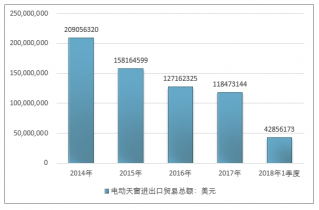 2016年我國電動天窗進出口貿易總額127162325美元,2017年進出口貿易總額118473144美元;2019年1季度進出口貿易總額42856173美元。