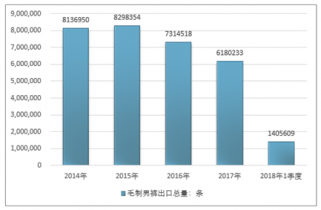 2016年我國(guó)毛制男褲出口總量7314518條,2017年出口總量6180233條;2018年1季度出口總量1405609條。