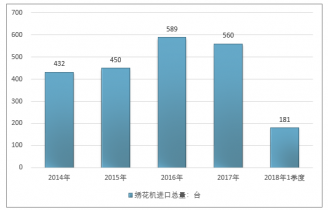 2016年我國繡花機進口總量589臺,2017年進口總量560臺;2018年1季度進口總量181臺。