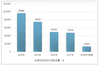 2016年我國繡花機進出口貿易總量49142臺,2017年進出口貿易總量47518臺;2018年1季度進出口貿易總量13323臺。