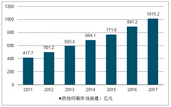 防偽技術多種多樣,防偽印刷技術的應用領域廣闊,其主要的形式是將防偽技術與印刷技術相結合,例如在印刷的油墨中加入化學物質形成獨特的具有防偽功能的油墨或是在印刷時加入防偽紋理圖案等,常用的還有激光全息技術、水印技術、電碼技術等,防偽印刷往往都是應用在包裝物上,進而也推動了包裝印刷業的發展。2017年我國防偽印刷行業市場規模約1015.2億元,同比2016年的891.2億元增長了13.91%,近幾年我國防偽印刷行業規模情況如下圖所示: