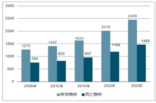 2012 年全球新增約 1410 萬例癌癥病例,癌癥死亡人數達 820 萬。預計到 2025 年,全球每年新增癌癥病例數將高達 2449 萬例。
