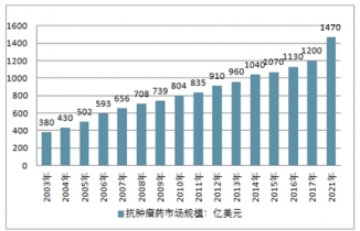 2003-2021年全球抗腫瘤藥市場規模及預測(單位:億美元,%)
