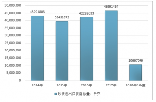 2016年我國砂紙進出口貿易總量42282033千克 ,2017年進出口貿易總量46591464千克 ;2019年1季度進出口貿易總量10667096千克 。