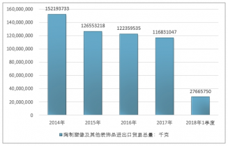 2016年我國陶制塑像及其他裝飾品進出口貿易總量122359535千克 ,2017年進出口貿易總量116831047千克 ;2019年1季度進出口貿易總量27665750千克 。