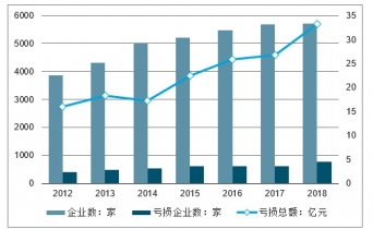 2012-2018年中國企業數量、企業虧損數量及虧損總額情況