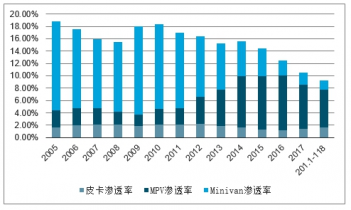 2005-2018年皮卡滲透率、MPV滲透率及Minivan滲透率走勢