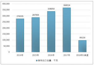 2016年我國碳布出口總量338050千克 ,2017年出口總量368324千克 ;2019年1季度出口總量99159千克 。