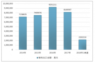 2016年我國碳布出口總額9251211美元,2017年出口總額8169397美元;2019年1季度出口總額2202210美元。