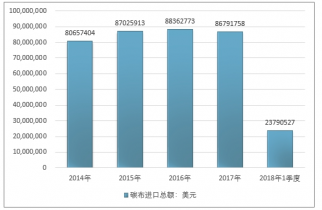 2016年我國碳布進口總額88362773美元,2017年進口總額86791758美元;2019年1季度進口總額23790527美元。