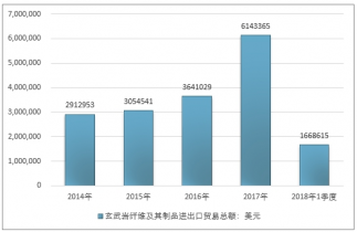 2016年我國玄武巖纖維及其制品進出口貿易總額3641029美元,2017年進出口貿易總額6143365美元;2019年1季度進出口貿易總額1668615美元。