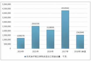 2016年我國玄武巖纖維及其制品進出口貿易總量2128505千克 ,2017年進出口貿易總量4310542千克 ;2019年1季度進出口貿易總量1562640千克 。