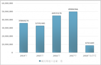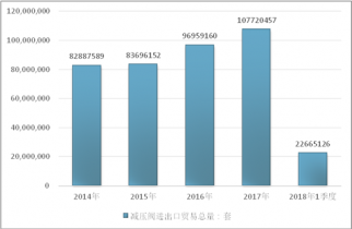 2016年我國減壓閥進出口貿易總量96959160套 ,2017年進出口貿易總量107720457套 ;2018年1季度進出口貿易總量22665126套 。