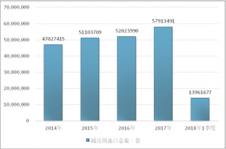 2016年我國減壓閥出口總量52023990套,2017年出口總量57913491套;2018年1季度出口總量13961677套。