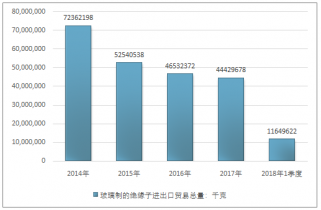 2016年我國玻璃制的絕緣子進出口貿易總量46532372千克,2017年進出口貿易總量44429678千克;2018年1季度進出口貿易總量11649622千克。