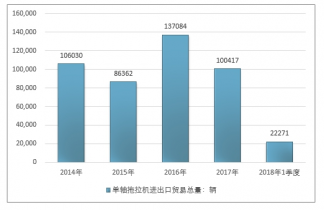 2016年我國單軸拖拉機進出口貿易總量137084輛 ,2017年進出口貿易總量100417輛 ;2019年1季度進出口貿易總量22271輛 。