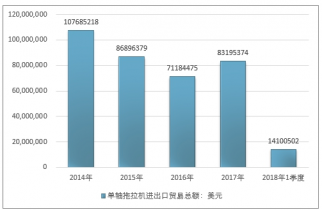 2016年我國單軸拖拉機進出口貿易總額71184475美元,2017年進出口貿易總額83195374美元;2019年1季度進出口貿易總額14100502美元。