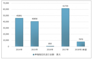 2016年我國單軸拖拉機進口總額850美元,2017年進口總額61734美元;2019年1季度進口總額7970美元。
