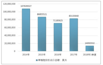2016年我國單軸拖拉機出口總額71183625美元,2017年出口總額83133640美元;2019年1季度出口總額14092532美元。