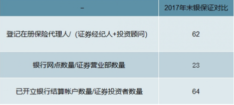 一方面,券商缺乏資金內生能力。與海外混業經營所不同,國內券商資管因為 牌照功能限制,需依賴產品銷售獲得外部資金。對比銀行具有吸存功能、保險資金 來源保費收入,券商資管資金主要來自于外部機構委外資金,體現在券商資管中專 戶與定向資管構成的私募資管占比超過80%。另一方面,人員配置與網點布局不及 銀保,銀保在客戶數量、群體結構豐富、營業部數量、地域覆蓋等遠勝券商。截至2019年末,證券投資者數量(已開立A股或B股賬戶 的自然人及非自然人)約1.47億,而開立銀行結算賬戶數量為94.03億,約為1:64倍 的懸殊。截至2017年末,證券營業部數量約 9900家,而銀行網點超過22.87萬個,約為1:23倍。再對比證保業務人員,2017年 末全國登記在冊保險代理人超過800萬,同期證券從業人員約36萬,其中證券經紀人 9萬,投資顧問約4萬,差距明顯。