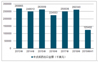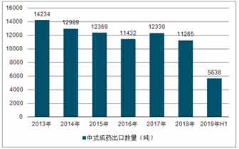 2013-2019H1中國中式成藥出口數量及出口金額統計表