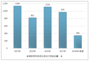 2016年我國磁粉探傷檢測儀進出口貿易總量1114臺,2017年進出口貿易總量974臺;2018年1季度進出口貿易總量345臺。
