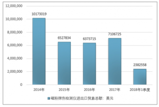 2016年我國磁粉探傷檢測儀進出口貿易總額6373715美元,2017年進出口貿易總額7106725美元;2018年1季度進出口貿易總額2382558美元。