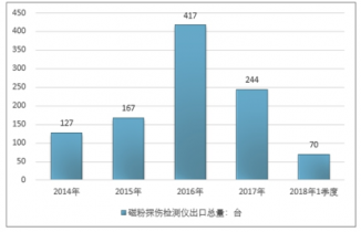 2016年我國磁粉探傷檢測儀出口總量417臺,2017年出口總量244臺;2018年1季度出口總量70臺。