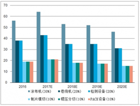 根據各環節價值量測算,涂布機價值量占比最大。預計2020年前涂布機/卷繞機/檢測設備/制片模切/輥壓分切/PACK設備市場空間分別約151/101/101/50/50/50億元。