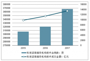 2015-2017年中國科技咨詢服務機構技術成交金額及合同數情況
