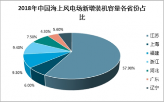 從區域分布來看,2018年,我國海上風電新增裝機分布在江蘇、浙江、福建、河北、上海、遼寧和廣東七省市;其中,江蘇新增海上風電裝機容量達95.8萬千瓦,占全國新增裝機容量57.9%,其次分別為浙江9.4%、福建9.3%、河北7.5%、上海6%、遼寧5.6%和廣東4.3%。