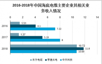 2016-2018年中國海底電纜主要企業其相關業務收入情況(單位:億元)