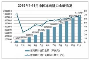 2019年1-11月中國凍雞進口金額為1735764千美元,同比增長67.2%。
