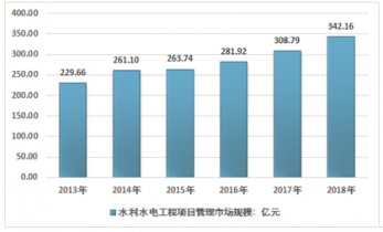 2017年我國水利水電工程項目管理市場規模為308.79億元,2018年我國水利水電工程項目管理市場規模增長至342.16億元。