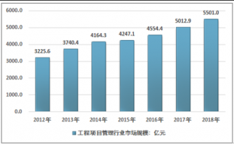 隨著我國經濟的快速發展,一方面,工程建設項目越來越多,業主要求的服務水平不斷提高,服務內容差異化日趨明顯;另一方面,隨著我國投資多元化發展,投資體制和工程建設管理體制等方面的改革不斷推進,服務內涵不斷加深。近幾年,我國工程項目管理行業市場規模快速增長,從2012年的3225.6億元增長到了2018年的5501億元。如下圖所示: