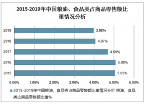 2019年我國商品消費總額為364928億元,同比增長7.9%,糧油食品消費占商品零售比重為3.98%。