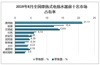 總體來說我國家用電熱水器市場集中度較高,2019年8月份全國即熱式熱水器品牌排名第.一的為奧特朗,零售額、零售量分別以21.11%及21.23%的市場份額穩(wěn)居第.一。
