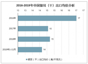 中國銀耳(干)出口均價也十分穩定,2018年中國銀耳(干)出口均價為14.70美元/千克,與上年基本持平。2019年1-11月,銀耳(干)出口均價14.15美元/千克。