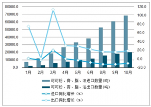 2019年1-10月中國可可粉、膏、脂、油累計進出口數(shù)量及增速趨勢圖