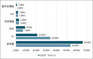 具體看射頻前端細分市場分布,2017到2023年間,濾波器市場占比最大將達到66%,功放PA占比略降達到21%,前兩者比例之和接近90%,其余開關、天線調諧、LNA、毫米波模組市場占比在9%、3%、2%、1%。