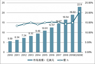 2017年全球市場規模達到14.47億美元,2017年及之后增速放緩,但預計到2020年期間仍保有9.5%的年化增長率,預計到2020年達到19.01億美元。
