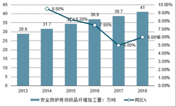 2013-2018年中國安全防護用紡織品纖維加工量達到41.0萬噸,較上年增加6.0%。